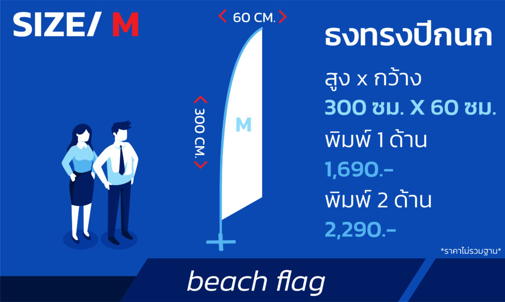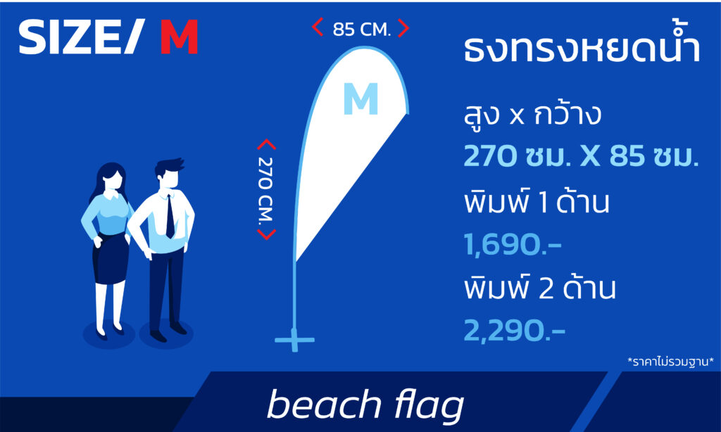 ธงชายหาด (Beach Flag) คืออะไร เป็นสื่อโฆษณาประเภทป้ายผ้าที่ติดตั้งบนเสาแบบพกพา ซึ่งเป็นที่นิยมอย่างมากสำหรับหน้าร้านค้า, งานอีเวนต์, บูธแสดงสินค้า, และกิจกรรมกลางแจ้งต่างๆ เพื่อดึงดูดความสนใจ, สื่อสารแบรนด์ และบอกตำแหน่งที่ตั้งของคุณได้อย่างมีประสิทธิภาพ ลักษณะเด่นและข้อดีของธงชายหาด รูปทรงโค้งมนเป็นเอกลักษณ์ มีหลากหลายรูปทรง เช่น ทรงขนนก (Feather Flag), ทรงหยดน้ำ (Teardrop Flag) และทรงสี่เหลี่ยม (Rectangle Flag) ที่ช่วยให้สื่อโฆษณาของคุณโดดเด่นไม่เหมือนใคร เคลื่อนย้ายและติดตั้งง่าย สามารถถอดประกอบ, เก็บใส่กระเป๋า และเคลื่อนย้ายไปใช้งานในสถานที่ต่างๆ ได้อย่างสะดวกและรวดเร็ว เหมาะสำหรับธุรกิจที่ต้องการความยืดหยุ่นสูง เพิ่มการมองเห็นจากระยะไกล ด้วยเสาที่สูงและพลิ้วไหวตามลม ทำให้มองเห็นได้ชัดเจน แม้ในพื้นที่กว้างขวาง เช่น ลานกิจกรรม, ห้างสรรพสินค้า หรือริมถนน ช่วยให้ธุรกิจของคุณเป็นที่สังเกตเห็นได้ง่าย ปรับดีไซน์ได้ตามแบรนด์ สามารถพิมพ์โลโก้, สี, ข้อความ, โปรโมชั่น หรือ QR Code ได้ตามความต้องการ เพื่อสร้างเอกลักษณ์และสื่อสารแบรนด์ของคุณได้อย่างเต็มที่ ความสำคัญของธงชายหาดและธุรกิจของคุณ เพิ่มยอดขายทางอ้อม ช่วยให้ลูกค้าหาสถานที่ของคุณได้ง่ายขึ้น และตัดสินใจแวะเข้าชมเร็วขึ้น ส่งผลดีต่อยอดขาย สร้างการจดจำแบรนด์ สี, โลโก้ และข้อความที่เห็นซ้ำๆ ช่วยเสริมสร้างการรับรู้และจดจำแบรนด์ในใจลูกค้า สื่อสารโปรโมชั่นทันใจ เหมาะสำหรับการแจ้งโปรโมชั่นพิเศษ, สินค้าใหม่ หรือกิจกรรมเฉพาะกิจได้อย่างรวดเร็วและตรงจุด เสริมภาพลักษณ์มืออาชีพ การใช้ธงชายหาดช่วยให้ร้านค้าหรือบูธของคุณดูเป็นระเบียบ ทันสมัย และน่าเชื่อถือมากยิ่งขึ้น หน้าสินค้า / ประเภทธง ธงชายหาด ทรงปีกนก (Bird wings beach flag) รูปทรงคลาสสิกที่พลิ้วไหวตามลม ดึงดูดสายตาได้ดี เหมาะสำหรับทุกธุรกิจ ธงชายหาด ทรงหยดน้ำ (Teardrop beach flag) ดีไซน์ทันสมัย โดดเด่น มองเห็นได้ชัดเจนจากทุกมุม เหมาะกับแบรนด์ที่ต้องการความแตกต่าง ธงชายหาด ทรงสี่เหลี่ยม (Rectangular beach flag) พื้นที่แสดงผลขนาดใหญ่ สามารถสื่อสารข้อความหรือโปรโมชั่นได้ครบถ้วน ชัดเจน ราคาสินค้า